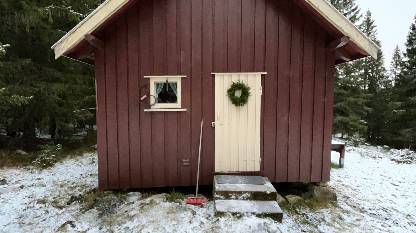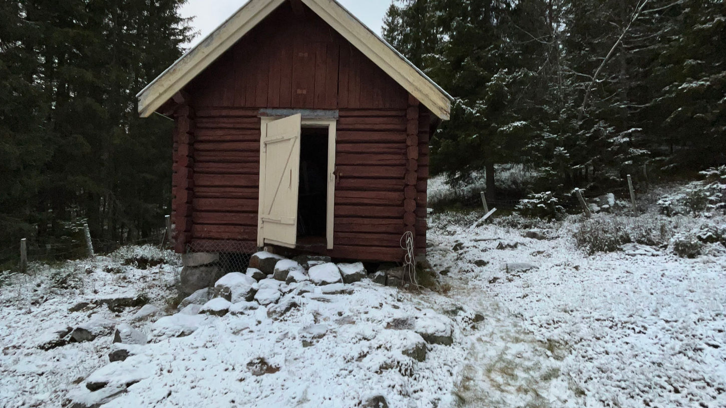 Liten hytte med vedskjul/uthus. P-plass på tunet. Veien inn er vinterstengt.