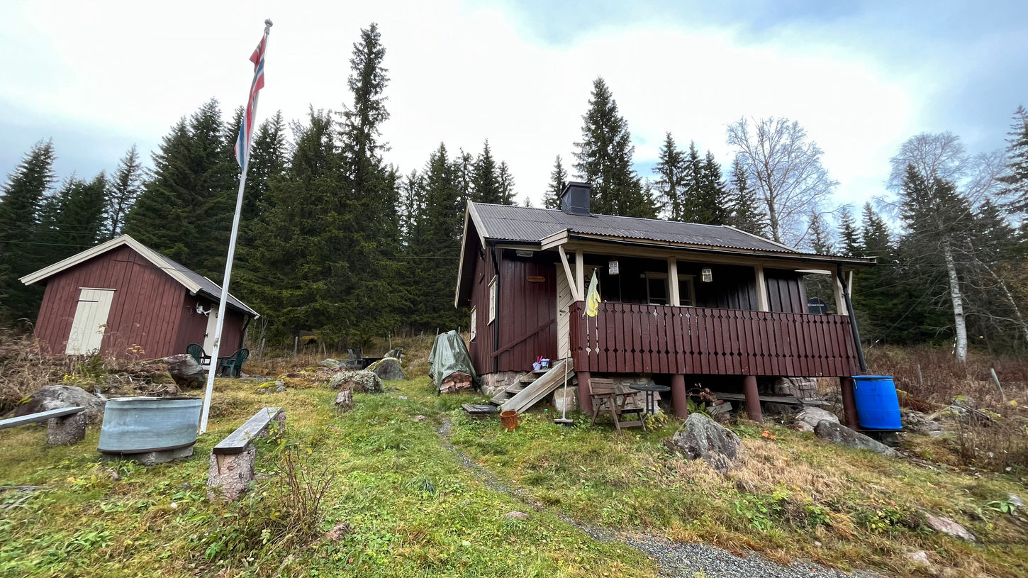 Liten hytte med vedskjul/uthus. P-plass på tunet. Veien inn er vinteråpen.